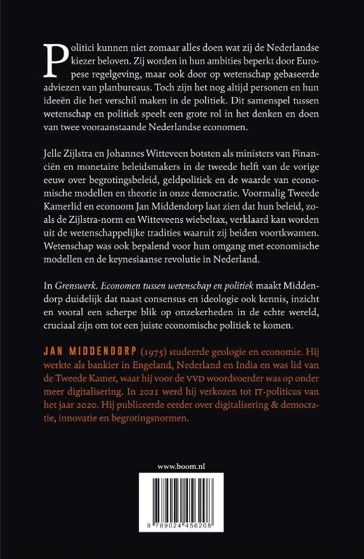 Politici kunnen niet zomaar alles doen wat zij de Nederlandse kiezer beloven. Zij worden in hun ambities beperkt door Europese regelgeving, maar ook door op wetenschap gebaseerde adviezen van planbureaus. Toch zijn het nog altijd personen en hun ideeën die het verschil maken in de politiek. Dit samenspel tussen wetenschap en politiek speelt een grote rol in het denken en doen van twee vooraanstaande Nederlandse economen. Jelle Zijlstra en Johannes Witteveen botsten als ministers van Financiën en monetaire beleidsmakers in de tweede helft van de vorige eeuw over begrotingsbeleid, geldpolitiek en de waarde van economische modellen en theorie in onze democratie. Voormalig Tweede Kamerlid en econoom Jan Middendorp laat zien dat hun beleid, zoals de Zijlstra-norm en Witteveens wiebeltax, verklaard kan worden uit de wetenschappelijke tradities waaruit zij beiden voortkwamen. Wetenschap was ook bepalend voor hun omgang met economische modellen en de keynesiaanse revolutie in Nederland. In Grenswerk. Economen tussen wetenschap en politiek maakt Middendorp duidelijk dat naast consensus en ideologie ook kennis, inzicht en vooral een scherpe blik op onzekerheden in de echte wereld, cruciaal zijn om tot een juiste economische politiek te komen. Jan Middendorp (1975) studeerde geologie en economie. Hij werkte als bankier in Engeland, Nederland en India en was lid van de Tweede Kamer, waar hij voor de VVD woordvoerder was op onder meer digitalisering. In 2021 werd hij verkozen tot IT-politicus van het jaar 2020. Hij publiceerde eerder over digitalisering & democratie, innovatie en begrotingsnormen.