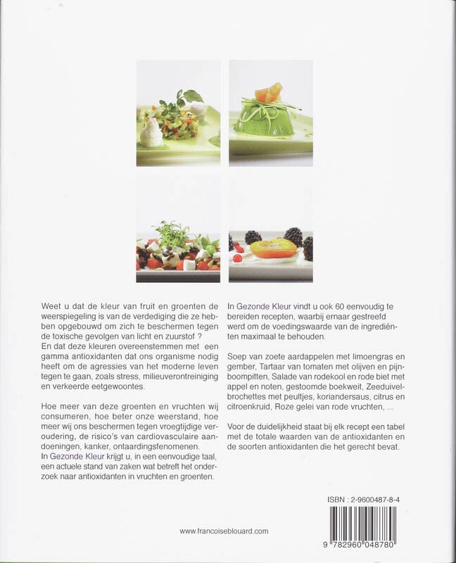 Bij fruit en groeten is de kleur de weerspiegeling van hun verdedigingmechanisme, de verdediging tegen de toxische gevolgen van licht en zuurstof. De antioxidatieve moleculen zijn ook de stoffen die kleur geven aan fruit en groenten. Hoe intensiever de kleur, hoe rijker aan antioxidanten. Bij de mens stemmen deze kleuren overeen met een gamma antioxidanten dat ons organisme nodig heeft om de agressieve invloeden van het moderne leven te bestrijden, agressoren zoals stress, milieuverontreiniging en verkeerde eetgewoontes. Meer fruit en groeten eten betekent dan ook meer weerstand. Hoe groter onze weerstand, hoe meer wij ons beschermen tegen vroegtijdige veroudering, de risico's van cardio-vasculaire aandoeningen, kanker... In Gezonde Kleur krijgt u, in een eenvoudige taal, een actuele stand van zaken in het onderzoek rond natuurlijke antioxidanten en wordt dit ook naar de praktijk omgezet met een 60-tal recepten, rijk aan smaak en kleur. Het zijn eenvoudig te bereiden recepten waarbij ernaar gestreefd werd om de voedingswaarde van de ingrediënten zo maximaal mogelijk te behouden. Een tabel verduidelijkt telkens de totale antioxidatieve waarde en geeft aan welke types antioxidanten er in het recept voorkomen. Dit werk baseert zich op de meest recente opzoekingen inzake de natuurlijke antioxidanten. Françoise De Keuleneer is juriste van opleiding, gediplomeerd in Nutritherapie. Ze staat achter een manier van koken die de kwaliteit van de voeding en de gezondheid respecteert. Auteur van het boek cc Lekker Vitaal'', samen met Paul Grégoire, . Joël Pincemail, Dokter in de Biomedische Wetenschappen, doet sinds 25 jaar opzoekingen in ziekenhuizen, inzake de rol van stress op oxidanten en antioxidanten. |