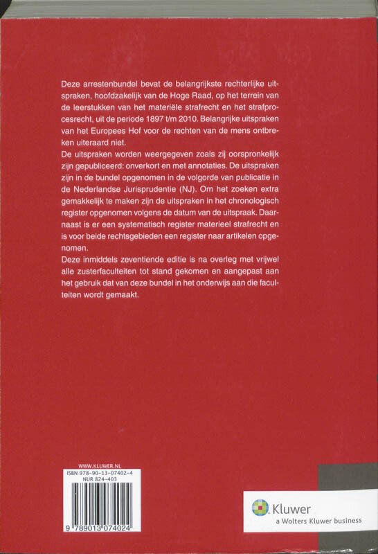 Deze arrestenbundel bevat de belangrijkste rechterlijke uitspraken, hoofdzakelijk van de Hoge Raad, op het terrein van de leerstukken van het materiële strafrecht en het strafprocesrecht, uit de periode 1897 t/m 2012. Belangrijke uitspraken van het Europees Hof voor de rechten van de mens ontbreken uiteraard niet. De uitspraken worden weergegeven zoals zij oorspronkelijk zijn gepubliceerd: onverkort en met annotaties. De uitspraken zijn in de bundel opgenomen in de volgorde van publicatie in de Nederlandse Jurisprudentie (NJ). Om het zoeken extra makkelijk te maken zijn de uitspraken in het chronologisch register opgenomen volgens de datum van de uitspraak. Daarnaast is er een systematisch register materieel strafrecht en is voor beide rechtsgebieden een register naar artikelen opgenomen. Deze inmiddels achttiende editie is na overleg met diverse zusterfaculteiten tot stand gekomen en aangepast aan het gebruik dat van deze bundel in het onderwijs aan die faculteiten wordt gemaakt.