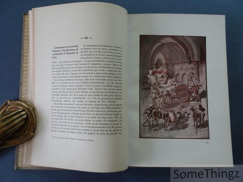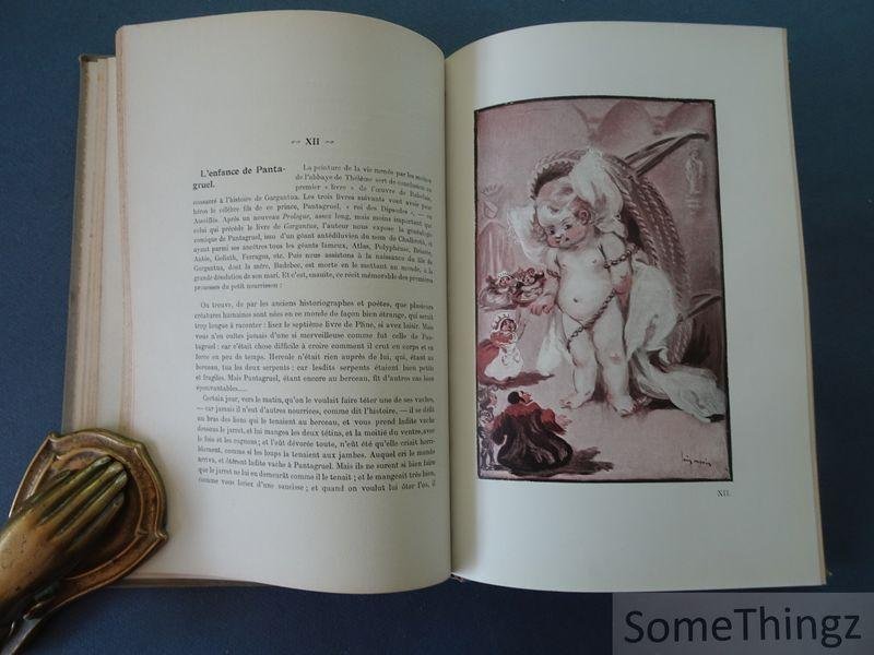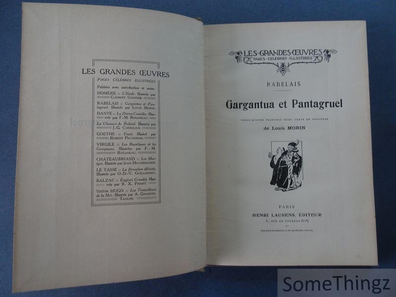 Oeuvre monumentale de la littérature de la Renaissance, Gargantua et Pantagruel de François Rabelais, ici illustrée par Louis Morin, est donnée dans un somptueux volume de la collection Les grandes oeuvres : pages célèbres illustrées (éditeur Henri Laurens, Paris, vers 1930). On y trouve : une sélection des passages les plus célèbres, mis en valeur par 24 planches en couleurs de Morin; de riches bandeaux et culs-de-lampe en noir et blanc; un bel objet patrimonial témoignant de la grandeur de l'imaginaire rabelaisien. Gargantua et Pantagruel, chef-d'oeuvre de la Renaissance humaniste, est un cycle romanesque en cinq livres qui mêle parodie des romans de chevalerie, satire sociale, réflexions philosophiques et éloge de l'éducation humaniste. Le premier volume (Pantagruel, 1532) introduit le géant Pantagruel ; le second (Gargantua, 1534-1535) narre la jeunesse de son père, le grand Gargantua, en opposition aux rigidités scolastiques de l'époque. Les volumes suivants poursuivent leurs aventures, notamment la quête de la Dive Bouteille. Rabelais use d'un mélange de langue populaire, de néologismes et de références érudites, invitant le lecteur à rechercher la «substantifique moelle» de son propos : une sagesse cachée sous une apparente bouffonnerie. Le texte défend l'éducation humaniste - libre, critique, joyeuse - contre l'enseignement figé ; il passe aussi en revue, avec verve et dérision, les moeurs politiques, religieuses et médicales de la société de l'époque.