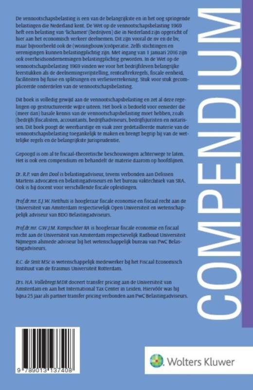 De vennootschapsbelasting is een van de belangrijkste en in het oog springende belastingen die Nederland kent. De Wet op de vennootschapsbelasting 1969 heft een belasting van #lichamen# (bedrijven) die in Nederland zijn opgericht of hier aan het economisch verkeer deelnemen. Dit zijn vooral de nv en de bv, maar bijvoorbeeld ook de (woningbouw)coöperatie. Zelfs stichtingen en verenigingen kunnen belastingplichtig zijn. Met ingang van 1 januari 2016 zijn ook overheidsondernemingen belastingplichtig geworden. In de Wet op de vennootschapsbelasting 1969 vinden we voor het bedrijfsleven belangrijke leerstukken als de deelnemingsvrijstelling, renteaftrekregels, fiscale eenheid, faciliteiten bij fusie en splitsingen en verliesverrekening. Stuk voor stuk gecompliceerde onderdelen van de vennootschapsbelasting. Dit boek is volledig gewijd aan de vennootschapsbelasting en zet al deze regelingen op gestructureerde wijze uiteen. Het boek is bedoeld voor eenieder die (meer dan) basale kennis van de vennootschapsbelasting moet hebben, zoals (bedrijfs)fiscalisten, accountants, bedrijfsadviseurs, bedrijfsjuristen en notarissen. Dit boek poogt de weerbarstige en vaak zeer gedetailleerde materie van de vennootschapsbelasting toegankelijk te maken en brengt begrip bij van de wettelijke regels en de belangrijkste jurisprudentie. Gepoogd is om al te fiscaal-theoretische beschouwingen achterwege te laten. Het is ook een compendium en behandelt de materie daarom op hoofdlijnen.