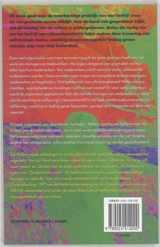 In dit boek leest u over de weerbarstige praktijk van het bedrijf Staver BV, waar na een reorganisatie succes uitblijft. Aan de hand van gesprekken blijkt dat de omslag van de cultuur is achtergebleven. Stap voor stap krijgt u inzicht in de acties die nodig zijn om het bedrijf een cultuurdoorstart te laten maken. De auteur behandelt cultuurverandering, zelfsturing, coaching en leiding geven. Het boek is bestemd voor (aankomende) managers en coaches die in organisaties partij zijn in veranderingsprocessen.