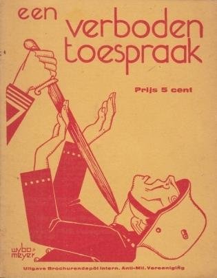 | Meer info: | Nieuwe Niedorp (N.H.), Brochurendepot intern. Anti-Mil. Vereeniging, 1934. 15 x 12 cm. Geniet. Omslagtekening in rood op geel door Wybo Meyer. 16 p. 1e druk. Keurig. Over het gebruik van de bajonet en het doden van krijgsgevangenen. Overdruk uit het blad De Wapens Neder. |