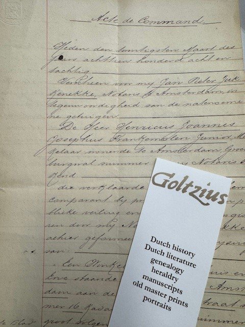 Acte de Commande handwritten and signed by civil notary Jan Pieter Jukkenneke dated 20 March 1888 concerning Oude Doelenstraat 16 Amsterdam. 3pp. handwritten official document signed by civil notary Jan Pieter Jukkeneke dated 20 March 1888 with Henricus Joannes Josephus Frankemolen Jr. real estate agent (makelaar), who bought the mentioned house for Henricus Gerardus Franciscus Wennink, shopkeeper, who resided in the house next door (Oude Doelenstraat 18), two witnesses: Van der Drift and Takes.