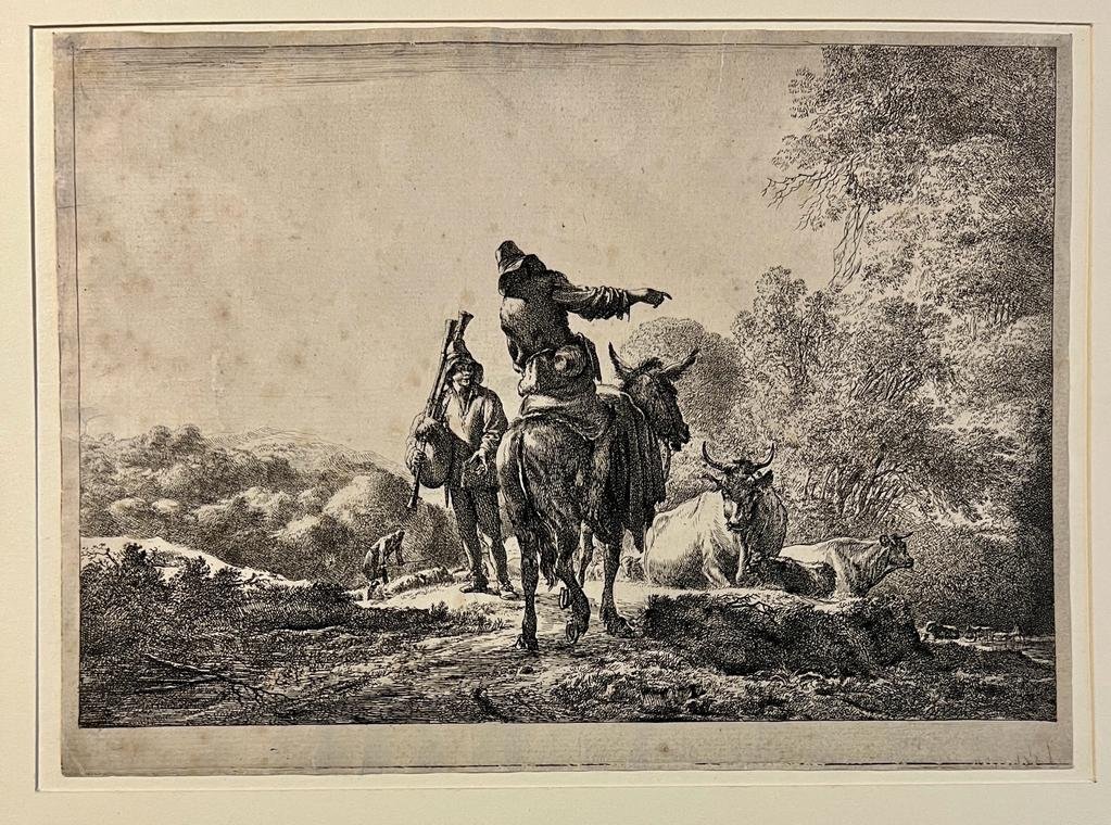 | Bijzonderheden: | A man riding a donkey talking to a man playing the bagpipe in the centre of the composition, cows to the right, a shepherd with a flock of sheep to the left, trees and mountains in the background; unfinished in some parts.This is first state which... |
