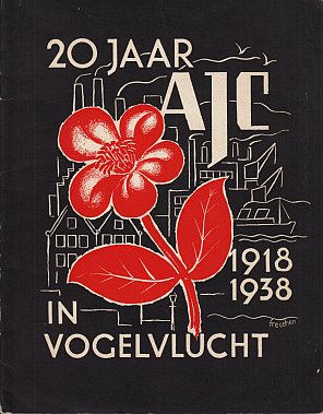 [Amsterdam], AJC, 1938. 27,5 x 20 cm. Original wrappers in red and black. 32 p. Richly illustrated. First edition. Slight traces of use. "20 years AJC in Bird's Flight". Attractive jubilee publication designed by Fré Cohen, with contribution by a.o. Koos Vorrink, Herman Molendijk, Tine & Jan Tinbergen, Marie W. Vos, Hein Vos, Margot Vos and Wim Thomassen. Many photos. Black proletarian wrappers with a large red rose and smoking factories - a design by Fré Cohen. Van Dam/ Van Praag 138.