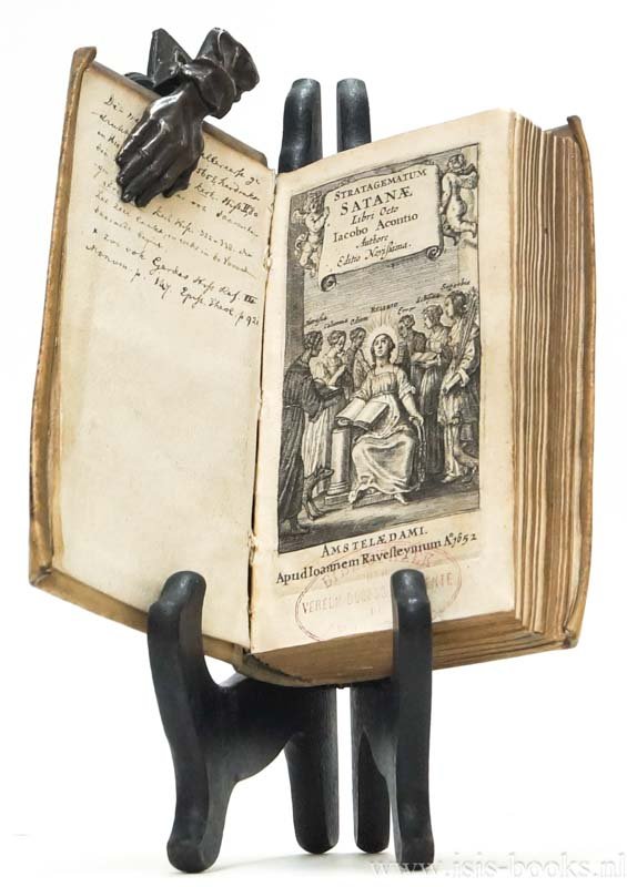 Latin text. On the endpaper old explanation in Dutch about the printing history of the book. The first edition was printed in Basel in 1565 and reprinted in 1610. 'Jacopo Aconcio (c.1520 - c.1566) was an Italian jurist, theologian, philosopher and engineer. He is now known for his contribution to the history of religious toleration'. (...) His heterodoxy is revealed in his Stratagematum Satanae libri octo, sometimes abbreviated as Stratagemata Satanae, published in 1565 and translated into various languages. The Stratagems of Satan are the dogmatic creeds which rent the Christian church. Aconcio sought to find the common denominator of the various creeds; this was essential doctrine, and the rest was immaterial. To arrive at this common basis, he had to reduce dogma to a low level, and his result was generally repudiated. Stratagemata Satanae was not translated into English until 1647, but afterwards, it became very influential among English liberal theologians.