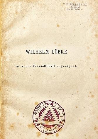 (Leipzig, Verlag von E.A. Seemann, 1871). Herbonden in karton door Electr. Boekbinderij J.M. Terwijn aan de Amsterdamse Lijnbaansgracht, blijkens een zwart-gouden boekmerkje. XII, 454 p. Met 29 afbeeldingen in houtgravure buiten de tekst. 2e vermeerderde druk. Rug verbruind. Papier roestig. Titelpagina niet meegebonden. Dit boek met zijn schitterend gedetailleerde romantische afbeeldingen van gotische kathedralen is afkomstig van H.P. Berlage, die in Zürich gestudeerd had en in zijn jonge jaren studiereizen door Duitsland maakte. Met een oud pretentieloos naamstempeltje op de eerste pagina, en daaronder een opvallend jugendstilstempel, en tenslotte plakte Berlage een nieuwer exlibris voorin waarin zijn initialen een expressionistisch breed uitgerekte vorm hebben gekregen.