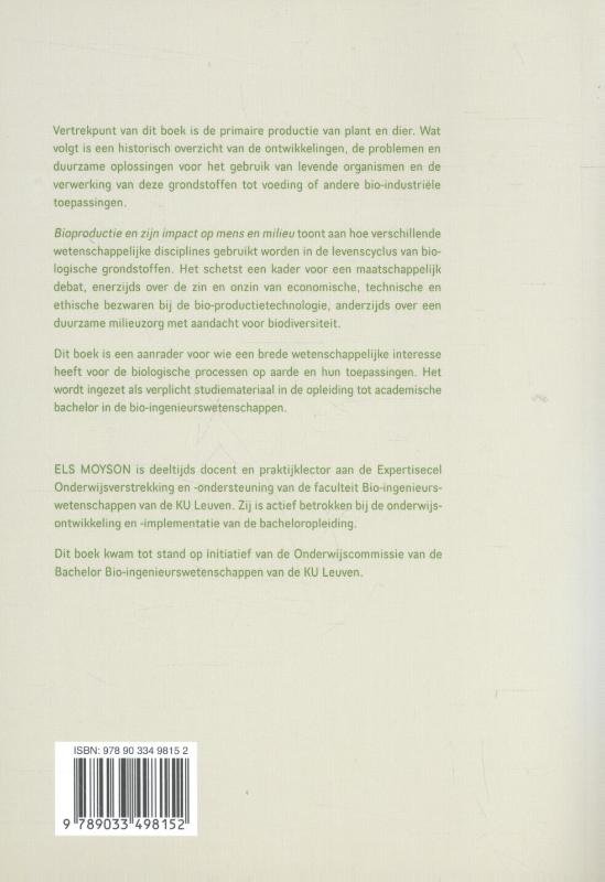 Vertrekpunt van dit boek is de primaire productie van plant en dier. Wat volgt is een historisch overzicht van de ontwikkelingen, de problemen en duurzame oplossingen voor het gebruik van levende organismen en de verwerking van deze grondstoffen tot voeding of andere bio-industriële toepassingen.Bioproductie en zijn impact op mens en milieu toont aan hoe verschillende wetenschappelijke disciplines gebruikt worden in de levenscyclus van biologische grondstoffen. Het schetst een kader voor een maatschappelijk debat, enerzijds over de zin en onzin van economische, technische en ethische bezwaren bij de bio-productietechnologie, anderzijds over een duurzame milieuzorg met aandacht voor biodiversiteit.