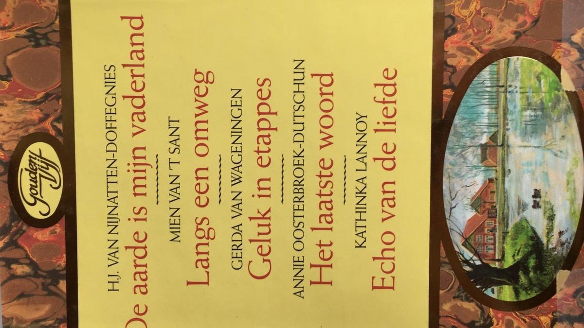| Meer info: | in deze uitgave de romans: De aarde is mijn vaderland van van Nijnatten-Doffegnies; Langs een omweg van Mine van 't Sant; Geluk in etappes van Gerda van Wageningen; Het laatste woord van Annie Oosterbroek-Dutschun en Echo van de liefde van Kathinka Lannoy |