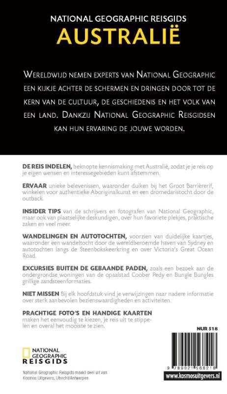 National Geographic Reisgids Australië is een exclusieve gids met sublieme fotografie die u meeneemt naar de bekende en minder bekende bezienswaardigheden. De experts van National Geographic nemen een kijkje achter de schermen en dringen door tot de kern van de cultuur, de geschiedenis en het volk van het land.Bezoek met deze National Geographic Reisgids Australië de wereldberoemde haven van Sydney, maak autotochten langs de Steenbokskeerkring en over Victoria's Great Ocean Road. Duik bij het Groot Barrièrerif, maak een dromedaristocht door de outback of winkel voor authentieke Aboriginalkunst. Of bezoek de ondergrondse woningen van opaalstad Coober Pedy en Bungle Bungles grillige zandsteenformaties.De uitgebreide kennismaking met Australië, het overzicht met belevenissen die je niet mag missen, de insider tips, de excursies buiten de gebaande paden en de reiswijzer met hotels en restaurants en de handige kaarten maken de gids compleet. Speciaal aanbevolen voor natuur- en cultuurliefhebbers!