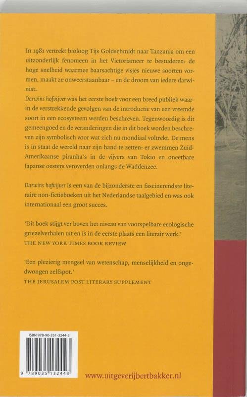In 1981 vertrekt bioloog Tijs Goldschmidt naar Tanzania om een uitzonderlijk fenomeen in het Victoriameer te bestuderen: de hoge snelheid waarmee baarsachtige visjes nieuwe soorten vormen, maakt ze onweerstaanbaar - en de droom van iedere darwinist.Darwins hofvijver was het eerste boek voor een breed publiek waarin de verstrekkende gevolgen van de introductie van een vreemde soort in een ecosysteem werd beschreven. Tegenwoordig is dit gemeengoed en de veranderingen die in dit boek worden beschreven zijn symbolisch voor wat zich nu mondiaal voltrekt. De mens is in staat de wereld naar zijn hand te zetten: er zwemmen Zuid-Amerikaanse piranha's in de vijvers van Tokio en oneetbare Japanse oesters veroverden onlangs de Waddenzee.Darwins hofvijver is een van de bijzonderste en fascinerendste literaire non-fictieboeken uit het Nederlandse taalgebied en was ook internationaal een groot succes.