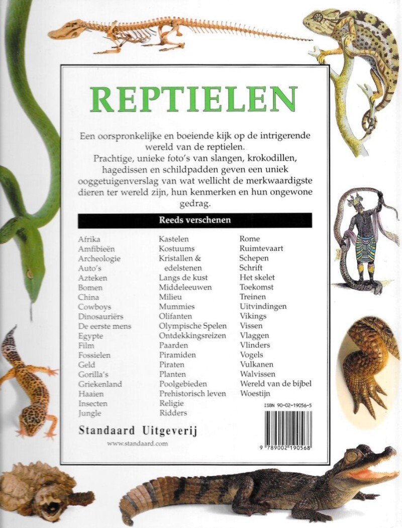 | Meer info: | Een oorspronkelijke en boeiende kijk op de intrigerende wereld van de reptielen. Prachtige, unieke foto's van slangen, krokodillen, hagedissen en schildpadden geven een uniek ooggetuigenverslag van wat wellicht de merkwaardigste dieren ter wereld zijn, hun kenmerken en hun ongewone gedrag. |