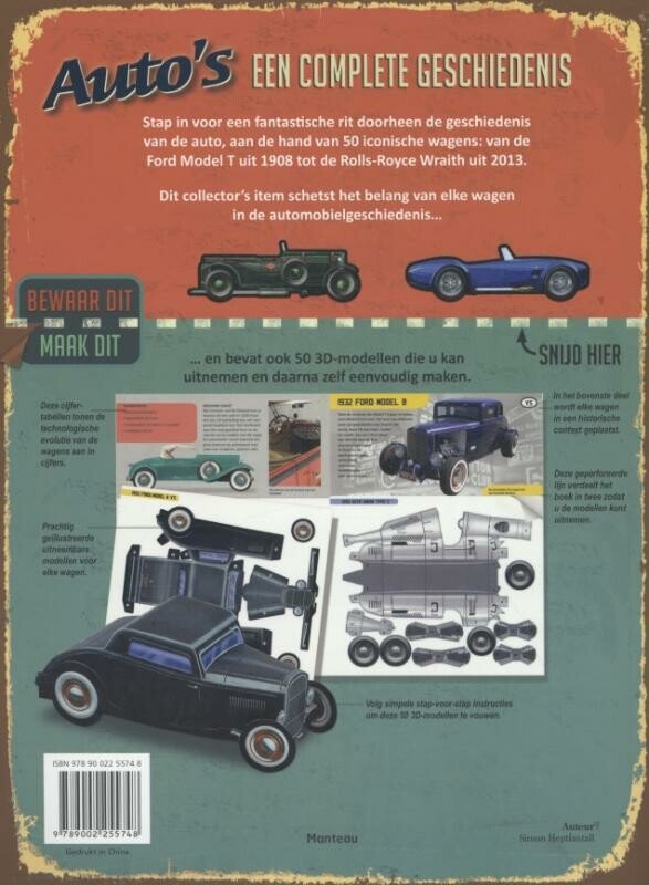 Stap in voor een fantastische rit doorheen de geschiedenisvan de auto, aan de hand van 50 iconische wagens: van deFord Model T uit 1908 tot de Rolls-Royce Wraith uit 2013.Dit collector's item schetst het belang van elke wagenin de automobielgeschiedenis en bevat ook 50 3D-modellen die u kanuitnemen en daarna zelf eenvoudig maken.