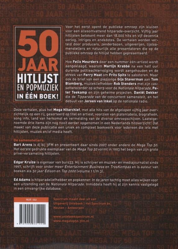 Een uniek en compleet boekwerk voor iedereen die iets met hitlijsten, muziek en/of media heeftVoor het eerst opent de publieke omroep zijn kluizen voor een allesomvattend hitparade-overzicht. Vijftig jaar hitlijsten betekent meer dan 18.000 hits en vijf decennia oorlog, intriges en anekdotes. In het eerste deel van het boek wordt in het verleden gedoken. De verhalen worden verteld door producers, zenderbazen, uitgeverijen, lijstsamenstellers en natuurlijk alle presentatoren die op de publieke omroep de hitlijst hebben gepresenteerd.Mega HitarchiefHet tweede deel van het boek bestaat uit het Mega Hitarchief. Alle hits van de afgelopen vijftig jaar overzichtelijk op een rij, gesorteerd op artiest en vervolgens op titel. Met:platenlabels* song info* land van herkomst* vermelding van de diverse omroepschijvenDe drie *-items zijn uniek, nooit eerder opgenomen in een Nederlands hitoverzicht! De samenstellers:Bart Arens is dj bij 3FM en presenteert daar sinds 2007 onder andere de Mega Top 50. Het eerste gedrukte exemplaar van de Mega Top 50 vormt in 1993 het begin van zijn grote privé-verzameling hitlijsten.Edgar Kruize is eigenaar van buro33. Hij is schrijver en muziek- en mediajournalist sinds 1997 is auteur van boeken als 50 jaar Edison en Top 2000 (volume 1 t/m 3).Ed Adams is hitparadeliefhebber en popkenner. In de jaren tachtig moet alles wijken voor een uitzending van de Nationale Hitparade. Inmiddels heeft hij al zijn kennis vastgelegd in een omvangrijke database.