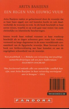 Al eeuwenlang is de mens gefascineerd door de woestijn. Dit wrede land betovert als geen ander en trekt telkens weer reizigers. Ook Arita Baaijens raakte in de ban van de woestijn. Ze gaf haar baan op, kocht kamelen en leerde in de woestijn te overleven. In Een regen van eeuwig vuur beschrijft ze haar ervaringen tijdens haar eerste reizen, waarbij zij op zoek ging naar restanten uit vroegere beschavingen. Ze beschrijft haar wanhoop als ze dagenlang niet weet waar ze is of geen water kan vinden, de vermoeiende lange dagmarsen en de soms verstikkende eenzaamheid. Maar bovenal is dit een boek over haar grote liefde voor de kamelen en de passie voor de ongrijpbare schoonheid van de woestijn.
