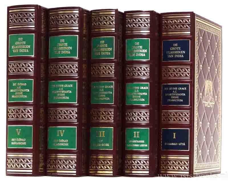 Band 1: De Bhagavad-Gita zoals ze is. Volledige uitgave. Oorspronkelijke Sanskrit-tekst, transkriptie, woord voor woord vertaling, vloeiende vertaling en uitgebreide betekenisverklaringen, Band 2: De Nektarzee van zuivere liefde. Volledige wetenschappelijke handleiding voor de beoefening van bhakti-yoga. Band 3: Het KRSNA boek. Band 4 : Het Srimad Bhagavatam. Eerste canto: De schepping. Band 5: Het Srimad Bhagavatam. Tweede canto: De kosmische openbaring.