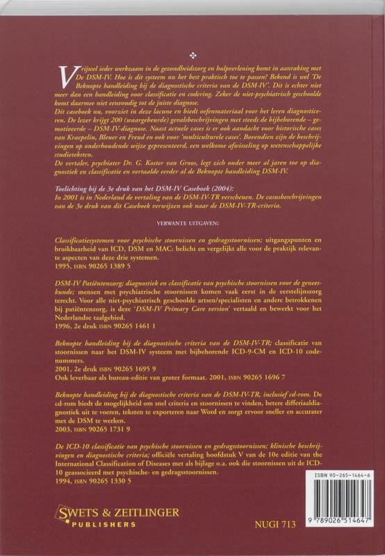 Werken met DSM-IV, 200 gevalsbeschrijvingen Redactie: Robert L. Spitzer, Miriam Gibbon, Andrew E, Skodol, Janet B.W. Williams, Michael B. First. Voor het Nederlands bewerkt door psychiater dr. G.A.S. Koster van Groos Het gebruik van de DSM-IV is in de praktijk niet altijd even eenvoudig. Aan de hand van een groot aantal (waargebeurde) gevalsbeschrijvingen in dit Caseboek kunnen (aankomende) clinici, artsen, therapeuten zich oefenen in het diagnosticeren volgens de DSM-IV-methode. Elke casus bevat een motivatie voor de diagnose en een verwijzing naar de corresponderende pagina's van de Beknopte handleiding bij de DSM-IV. Naast actuele wordt er ook een aantal historische cases behandeld van onder anderen Kraepelin, Bleuler en Freud. Tevens bevat dit boek een groot aantal internationale cases. Uitgebreide registers maken het mogelijk zowel op naam van de casus te zoeken als op onderwerp of op DSM-IV- classificatie. |