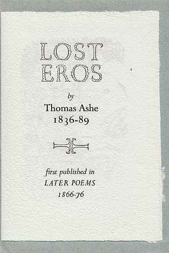 Llandogo, The Kouros Press, 1982. 24 x 16 cm. Original wrappers with a title ticket. 4 p. Set by hand and printed by Nicolas McDowall in 100 numbered copies on paper hand-made by Frances McDowall, with a Uranian linocut in ochre by J. Martin Pitts. Tiny crease. A poem by Thomas Ashe (1836-1889), first published in 'Later Poems' 1866-1876.