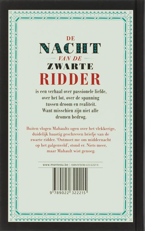 ‘Was je verliefd als je tientallen vleermuizen voelde in je buik bij het lezen van het berichtje van de dag? Red mij…Als je hart een sprongetje maakte bij het zien dat ‘de’ zwarte ridder was vervangen door ‘je’ zwarte ridder?Ik ben verloren als hij niet hetzelfde voelt…Nee, dan was je niet verliefd, dan was je gewoon gestoord. Gewoon gestoord, gewoon gestoord, echode het in Lentes hoofd. Gestoord, geobsedeerd, willoos overgeleverd aan het spel van een of andere pervert!’Lente droomt. Ze droomt van een prinses die moet trouwen met een prins, maar haar hart verliest aan een gemaskerde ridder. Het lijkt onschuldig, tot Lente mailtjes ontvangt, ondertekend door de ridder uit haar dromen. Lentes dromen nemen haar steeds meer in beslag en langzaam maar zeker versmelten ze met de werkelijkheid. Moet ze haar afspraak met de zwarte ridder nakomen?De nacht van de zwarte ridder is een verhaal over passionele liefde, over het lot, over de spanning tussen droom en realiteit. Want misschien zijn niet alle dromen bedrog.