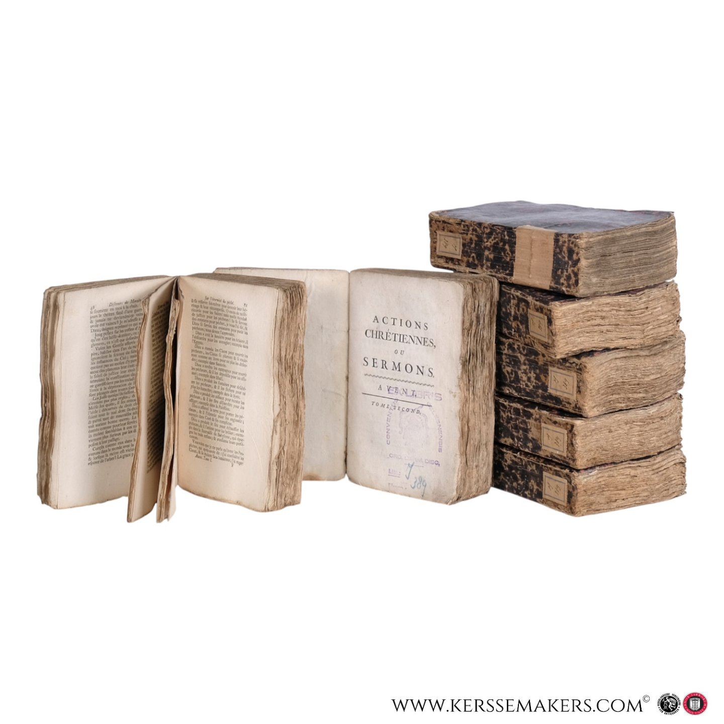 margined paper, occasional library stamps. Incomplete set: lacking Discours de morale pour l’octave du Sacrement, Carême vols. I and IV, Panégyriques vols. I, II and VI. Scarce mid-18th century Liège edition of Simon de la Vierge’s extensive sermon cycle Actions chrétiennes, divided into Panégyriques, Carême and Avent. A substantial fragment of the complete 11-volume set.
