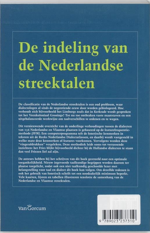 "De classificatie van de Nederlandse streektalen is een oud probleem, waar dialectologen al sinds de negentiende eeuw door worden gebiologeerd. Hoe verhoudt zich bijvoorbeeld het Limburgs zoals dat in Kerkrade wordt gesproken tot het veenkoloniaal Gronings? Tot nu toe ontbraken vaste maatstaven en een uitgebalanceerde werkwijze om taalverschillen te ordenen en te wegen.Dit vernieuwende overzicht van de onderlinge verhoudingen tussen de dialecten van 156 Nederlandse en Vlaamse plaatsen is gebaseerd op de featurefrequentiemethode (FFM). Een computerprogramma telt de fonetische kenmerken in teksten uit de Reeks Nederlandse Dialectatlassen, en daarbij wordt vastgesteld in welke mate deze kenmerken of features voorkomen. Vervolgens worden deze ìvingerafdrukkenî vergeleken. Deze methodiek leidt soms tot verrassende inzichten: het Fries blijkt bijvoorbeeld dichter bij de Hollandse dialecten te staan dan veel Friezen lief zal zijn.De auteurs hebben bij het schrijven van dit boek gestreefd naar een optimale toegankelijkheid. Nieuw ingevoerde taalkundige begrippen worden daarom ter plaatse toegelicht, zodat ook een niet taalkundig geschoolde lezer met belangstelling voor taal en dialect dit boek kan volgen. Om dezelfde redenen is ook het gebruik van fonetisch schrift tot een noodzakelijk minimum beperkt. Vele kaarten, lijsten en tabellen illustreren tenslotte de samenhang van de Nederlandse en Vlaamse streektalen."
