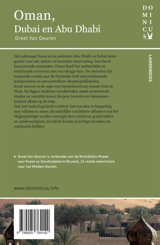 Het sultanaat Oman en de emiraten Abu Dhabi en Dubai staan garant voor een unieke en boeiende reiservaring, boordevol fascinerende contrasten. Oman heeft het authentieke en traditionele verweven met een vleugje luxe. De emiraten zijn bruisende oorden aan de Perzische Golf met schitterende hotelpaleizen en onvoorstelbare shopmogelijkheden.Sinds eeuwen is de regio een handelscentrum tussen Oost en West. Nu liggen moderne wereldsteden naast eeuwenoude stadjes en verstilde lemen dorpen; kamelen en limousines kruisen elkaar op de weg.Ook het landschap biedt variëteit: het noorden is bergachtig met valleien en oases, de zuidelijke vruchtbare uitlopers van het Hajjargebergte worden omringd door eindeloze grindvlakten en zandwoestijnen, terwijl de kusten prachtige stranden en rotsbaaien hebben.Greet Van Deuren is verbonden aan de Koninklijke Musea voor Kunst en geschiedenis in Brussel. Ze reisde meermalen naar het Midden-Oosten.