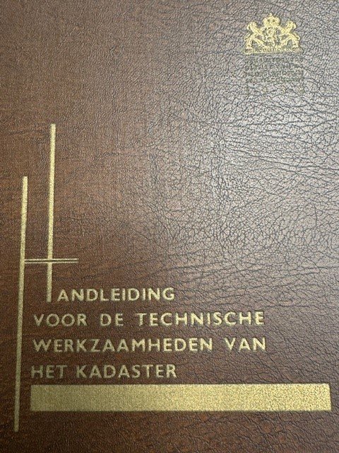 Handleiding voor de technische werkzaamheden van het kadaster. Vastgesteld bij de beschikking van de staatssecretaris van financien van 28 mei 1956, nr. 41 's Gravenhage, Algemene Landsdrukkerij, 1938, 110pp. original linen hardcover binding. Complete with all fold out charts in folder in the binding. Important technical work on the scientific activities of the Dutch kadaster.