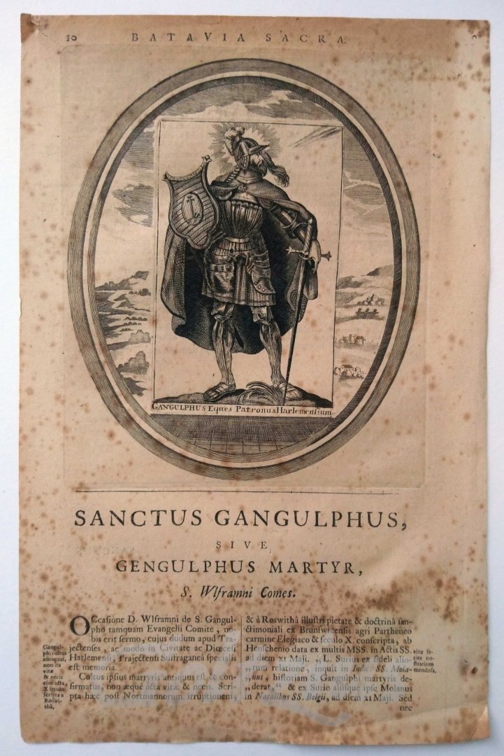 Gangulphus eques patronus Harlemensium Portrait of St. Gangulphus of Burgundy in armour, holding a sword and shield. This (rectangular) image is set inside of an oval landscape. Etching inside of an oval engraving, with letterpress text underneath. Sheet size 321 x 207 mm., platemarks 196 x 160 and 131 x 82 mm. Anonymous print, published in the first edition of Hugo van Heussen's 'Batavia Sacra' (Brussels: François Foppens, 1714). This is possibly a copy (in reverse) of Cornelis Visscher's engraving of the same subject. Dark spots in the margins and edges of the image area. Pinholes in the top margins, some discolouration in the top edge, and a small tear in the top left corner. In fair condition.
