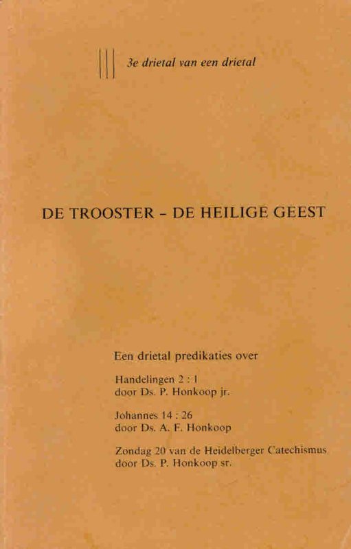 De Trooster-De Heilige Geest is het derde drietal preken van een drietal, nl. ds. P. Honkoop sr., ds. A.F. Honkoop en ds. P. Honkoop jr. - Ds. P. Honkoop jr.-Handelingen 2:1 - Ds. A.F. Honkoop-Johannes 14:26 - Ds. P. Honkoop sr.-Zondag 20 van de Heidelbergse Catechismus. |