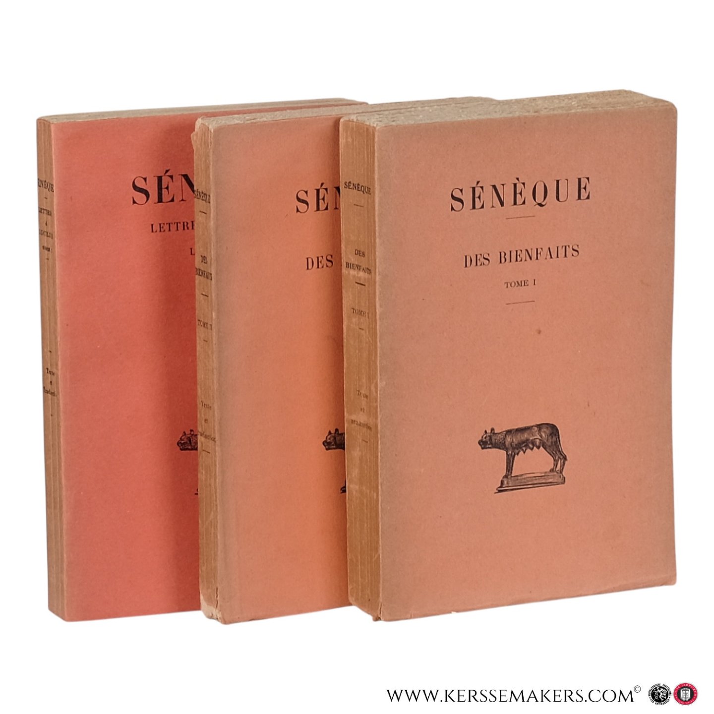 300–400 pages each. Text in Latin and French. Covers and spines somewhat faded and browned, foxing to the first volume, edges spotted, but still good copies, see pictures. Two early Budé volumes of *De Beneficiis* (1926–1927) together with the first volume of the *Lettres à Lucilius* (1959, third edition), all with Latin text and French translation. Standard scholarly editions.