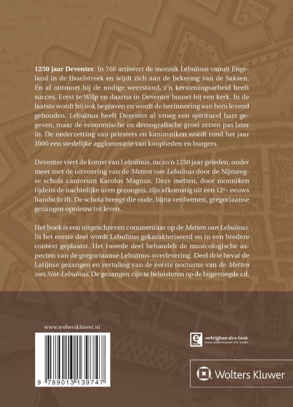 1250 jaar Deventer. In 768 arriveert de monnik Lebuïnus vanuit Engeland in de IJsselstreek en wijdt zich aan de bekering van de Saksen. En al ontmoet hij de nodige weerstand, z#n kersteningsarbeid heeft succes. Eerst te Wilp en daarna in Deventer bouwt hij een kerk. In de laatste wordt hij ook begraven en wordt de herinnering aan hem levend gehouden. Lebuïnus heeft Deventer al vroeg een spiritueel hart gegeven, maar de economische en demografi sche groei zetten pas later in. De nederzetting van priesters en kanunniken wordt rond het jaar 1000 een stedelijke agglomeratie van kooplieden en burgers. Deventer viert de komst van Lebuïnus, nu zo#n 1250 jaar geleden, onder meer met de uitvoering van de Metten van Lebuïnus door de Nijmeegse schola cantorum Karolus Magnus. Deze metten, door monniken tijdens de nachtelijke uren gezongen, zijn afkomstig uit een 12e - eeuws handschrift. De schola brengt die oude, bijna verdwenen, gregoriaanse gezangen opnieuw tot leven. Het boek is een uitgeschreven commentaar op de Metten van Lebuïnus. In het eerste deel wordt Lebuïnus gekarakteriseerd en in een bredere context geplaatst. Het tweede deel behandelt de musicologische aspecten van de gregoriaanse Lebuïnus-overlevering. Deel drie bevat de Latijnse gezangen en vertaling van de eerste nocturne van de Metten van Sint-Lebuïnus. De gezangen zijn te beluisteren op de bijgevoegde cd