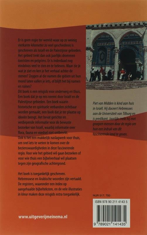 Er is geen regio ter wereld waar op zo weinig vierkante kilometer zo veel geschiedenis is geschreven als Isra en de Palestijnse gebieden.Het gebied trekt dan ook jaarlijks drommen toeristen en pelgrims. Er is inderdaad nog eindeloos veel te zien en te beleven. Maar zie je wat je ziet en ken je het verhaal achter de stenen? Zeggen al die namen die gidsen uit hun mond laten vallen je iets, of blijft het bij namen en ru s?Dit boek is een reisgids voor onderweg en thuis. Een boek dat je op reis neemt door Isra en de Palestijnse gebieden. Een boek waarin historische en spirituele verbanden zichtbaar worden gemaakt, een boek dat je ter plaatse op idee brengt. Het bevat gerichte en verdiepende informatie voor de bewuste bezoeker van Isra waarbij informatie over flora, fauna en voedsel niet ontbreekt.Ook is het een makkelijk naslagwerk voor thuis, om snel iets te weten te komen over de bezienswaardigheden in deze fascinerende regio. Voor wie het gebied wil gaan bezoeken of voor wie thuis een bijbelverhaal wil plaatsen tegen zijn geografische achtergrond.Het boek is toegankelijk geschreven. Hebreeuwse en Arabische woorden zijn vertaald. De registers, waaronder een index op aangehaalde bijbelteksten, en de vele illustraties in kleur maken deze reisgids extra toegankelijk.Piet van Midden is kind aan huis in Isra Hij doceert Hebreeuws aan de Universiteit van Tilburg en is predikant. Jaarlijks trekt hij met groepen. mensen door de regio om hun een indruk van dit fascinerende land te geven.