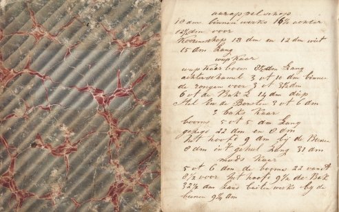 Ongelinieerd schrift met halflinnen band en gemarmerde platten. 15 beschreven bladzijden in bruine inkt met regelmatig, goed leesbaar cursief handschrift. Inliggend een rekening van Boekdrukkerij, Boek- & Papierhandel A. Mulder in Pekela, gedateerd 1884. De eerste tien bladzijden betreffen notities voor het bouwen van karren en landbouwwerktuigen, zoals een 'wup kaar' (wipkar), Harding zijn wagen, Maasingh (Maarsing) zijn wagen, Zoetekerk zijn wagen, Kempers wagen (een luxueuze koets!), drie baks kaar en een Groot Kinder Kaartje. 'Een voetploeg - de boom 8 v[oe]t L- de staart 4 vt behouden van de strijkzool tot aan de binnenkant van de boom 9½ de trekschei 3 d[ui]m van Vr de vt 2½ dm van de schei de Loop 3 vt 8 dm lang molbred 3 vt min 4 dm Lang.' In hetzelfde handschrift nog een redevoering van 5 bladzijden voor 'Veel geachte Onderwijzer!' als secretaris van 'ons Zanggezelschap'. De namen Zoetekerk (Pekela), Kemper (Veendam), Harding en Maarsing (beiden Bellingwolde) vinden we gecombineerd in de bovenlagen van 19e-eeuws Oost-Groningen. Een kijkje in het Veenkoloniale dorpsleven!