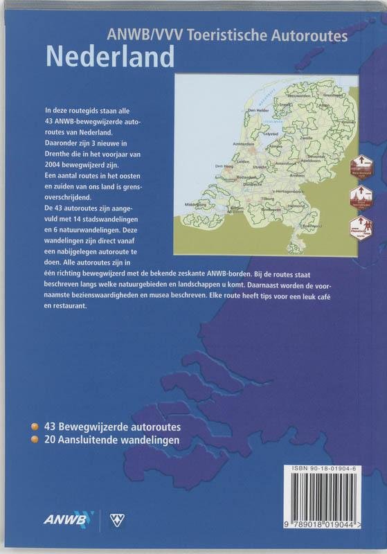 In deze routegids staan alle 43 ANWB-bewegwijzerde autoroutes van Nederland. Daaronder zijn 3 nieuwe in Drenthe die in het voorjaar van 2004 bewegwijzerd zijn. Een aantal routes in het oosten en zuiden van ons land is grensoverschrijdend. De 43 autoroutes zijn aangevuld met 14 stadswandelingen en 6 natuurwandelingen. Deze wandelingen zijn direct vanaf een nabijgelegen autoroute te doen. Alle autoroutes zijn in één richting bewegwijzerd met de bekende ANWB-borden. Bij de routes staat beschreven langs welke natuurgebieden en landschappen u komt. Daarnaast worden de voornaamste bezienswaardigheden en musea beschreven. Elke route heeft tips voor een leuk café en restaurant. |