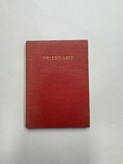 | Meer info: | Friendship - miniature book London, Henry Frowde, no date, colourprinted frontispiece portrait of Emerson (coming loose from binding), text by Emerson on friendship, original hardcover binding, gilt title on front. Dedicated by Annie van Oord to Betty, handwritten on endpaper, good copy. |