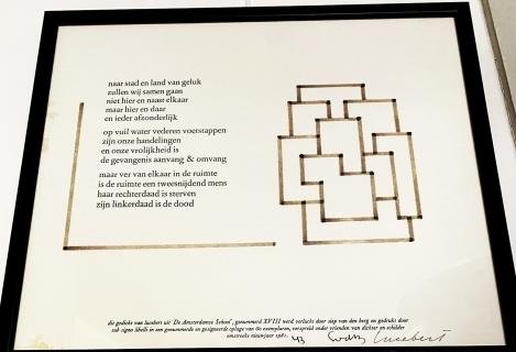 | Meer info: | Sub Signo Libelli, [1980]. 30 x 36 cm. Planodruk. Ingelijst achter glas. Met de hand gezet en gedrukt in een genummerde en door auteur en kunstenaar gesigneerde oplage van 60 exemplaren. Paar vochtvlekjes in de linkermarge. Eerder gepubliceerd in De Amsterdamse School. Breugelmans 64. |