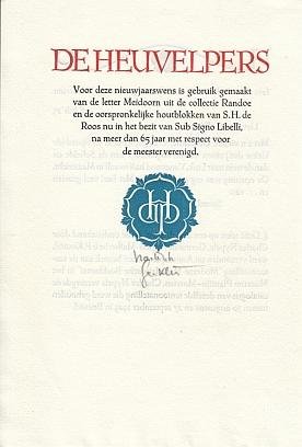 [Geesbrug], Sub Signo Libelli, (2001). Vouwblad. Gezet uit de letter Meidoorn, verlucht met oorspronkelijke houtblokken van De Heuvelpers en gedrukt in rood, blauw en zwart op een restant papier dat A.A.M. Stols had laten maken voor de Compagnie Typographique in ca. 85 exemplaren (waarvan er 15 werden afgekeurd). Nieuwjaarswens voor 2002. Schitterende uitgave met de monumentale, zelden geziene blokken en de Meidoorn. Breugelmans 254 a. Het eerste exemplaar heeft een handgeschreven groet van de drukker in potlood.