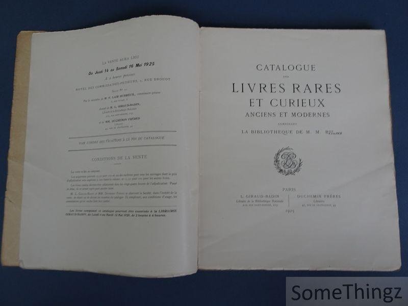 Catalogue des livres rares et curieux anciens et modernes composant la bibliotheque de M. M. B. Cette edition presente la selection complete proposee a la vente publique tenue a Paris du 14 au 16 mai 1925. On y trouvera une importante collection d'imprimes anciens, d'ouvrages modernes rares, d'ouvrages illustres et de reliures remarquables. Chaque lot est brièvement decrit et illustre par des planches en noir et blanc. Ce catalogue recense environ 372 lots comprenant livres anciens et modernes, curiosites bibliographiques, editions rares et reliures. Ce catalogue constitue un instrument indispensable pour le bibliophile et le collectionneur, ainsi qu'un temoignage precieux de la provenance et de la mise en vente d'ouvrages de choix.
