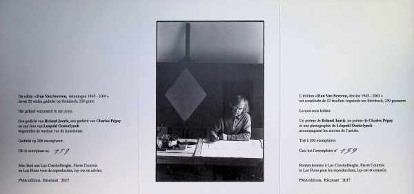 Dan Van Severen Dessins – tekeningen 1945 – 2003 Uitgegeven door Baudouin Oosterlynck en PMA-editions . Tweetalige uitgave Ned/Frans, oblong 21 x 45 cm, nieuwstaat “Dan Van Severen tekeningen-dessins 1945-2003” bevat 22 vellen gedrukt op Steinbach 250 gram. Het geheel verzameld in een doos, gedrukt op 200 exemplaren. Een gedicht van Roland Jooris, een gedicht Van Charles Péguy en een foto van Leopold Oosterlynck begeleiden de werken van de kunstenaar. Gecrukt op 200 exemplaren. Dit is nummer 159/200. De originele werken van de uitgave weorden tentoongesteld in de ruimte van galerij H8x12 tijdens een tentoonsteling van 9 -11 juni 2017. Dan Van Severen geboren te Lokeren is een geometrisch abstract schilder en tekenaar (tempera en inkt). Opleiding aan Sint-Lucas Gent (1941-48), de Academie van Antwerpen en het NHISKA (1951-54, A. Marstboom). Prijs JPB (1956 en 58). Medestichter van G 58-Hessenhuis. Deelname aan Documenta IV Kassel (1968). Schilderkunst van een vredige geometrie, immobiele mathematica, iconen van stilte met een metafysische dimensie. Vanaf 1954 worden verticalen en horizontalen, ruit en vierkant de hoofdcomponenten van zijn werk en evolueert zijn koloriet naar grijzen en witten. Leraar aan Sint-Lucas Gent (tot 1992). Werk in de Musea van Antwerpen, Brugge, Brussel, Gent, Ieper, Kortrijk en Oostende (PMMK). Op 15 februari 2009 is kunstenaar Dan Van Severen is overleden in een Gents ziekenhuis. [Deze omschrijving kan vertaald zijn met AI.] PMA editions, 2017, Rixensart |