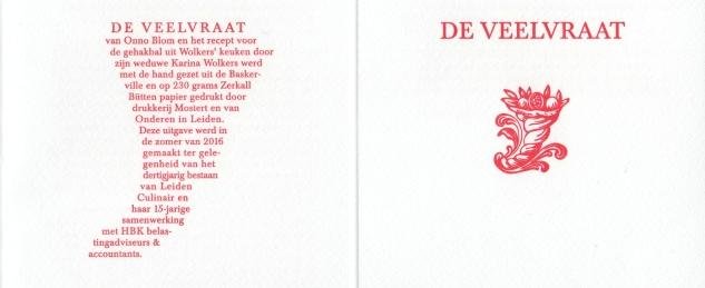 (Leiden, Leiden Culinair/ HBK belastingadviseurs & accountants, 2016). 36 x 13 cm. Vouwblad. Met de hand gezet uit de Baskerville en gedrukt in rood op 230 grams Zerkall Bütten door Mostert en Van Onderen in een beperkte oplage. 1e druk. Onno Blom schrijft over Wolkers' eetlust en culinaire gastvrijheid, Karina Wolkers verklapt het recept van de gehaktballen die haar man maakte. Niet in WorldCat.
