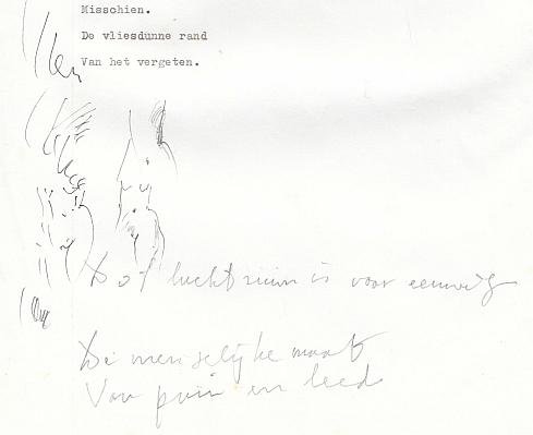 Handschrift in potlood (1) en typoscript (2). Drie bladen. Het gedicht 'Na de zomer' bestaat uit drie afdelingen, I, II en III. Dit zijn de originelen van de derde afdeling 1. Handschrift in potlood. 29,5 x 21,0 cm. Geschreven op de achterzijde van een brief van Stichting LIRA uit 2001. In deze versie heeft het gedicht nog elf regels (in de uiteindelijke versie zijn het er veertien). Er staat ook nog een opmerking bij die wellicht ergens anders voor diende: 'Als ik niet zoveel praatjes had/ Dan was ik ook geen rugstreeppad'. 2. Typoscript. 26,6 x 21,0 cm. Elf regels met vijf kandidaatregels in potlood. Met drie rudimentaire vrouwentekeningen, waarvan twee in potlood en éen in inkt. 3. Typoscript. 25,4 x 21,0 cm. Twaalf regels met drie kandidaatregels in potlood. Gepubliceerd in NRC Handelsblad van 27 september 2002. Later opgenomen in Verzamelde gedichten (2008).