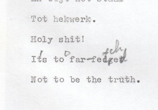 Typoscript. 29,5 x 21 cm. Alleen recto. Met potloodcorrecties in de zevende ('Zakken' werd 'Zinken') en de eennalaatste regel. Gepubliceerd in NRC Handelsblad van 12 oktober 2001, en aan het eind van dat jaar als jaarwisselingsgeschenk van Antiquariaat En Passant en in 2002 als relatiegeschenk van adviesbureau Stupers van der Heijden. Later opgenomen in Verzamelde gedichten (2008).