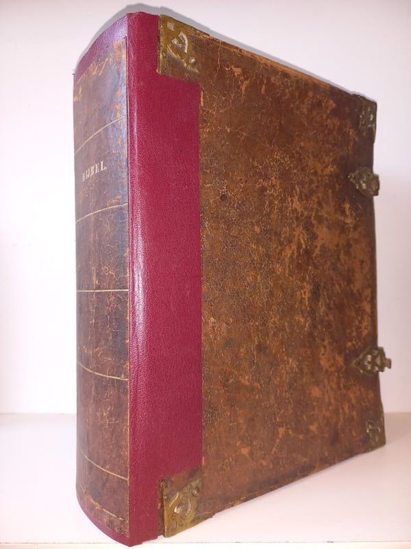 Met koperen sloten, hoeken en kanttekeningen en met in te vullen familieregister voorin.