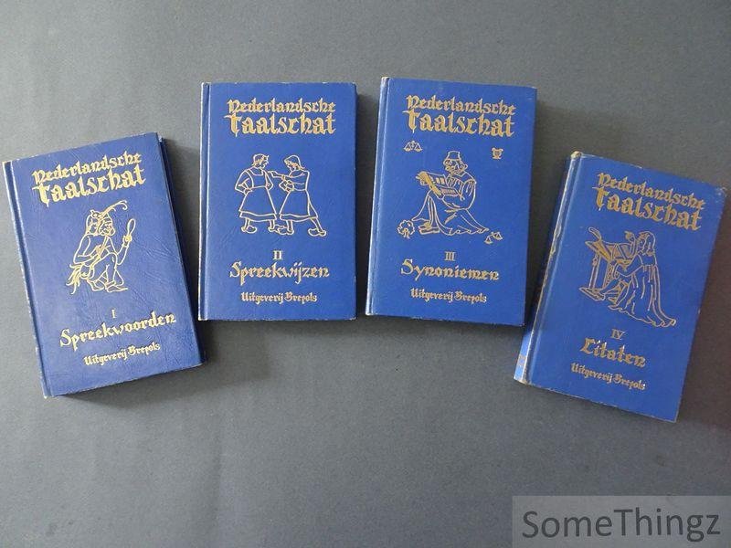 | Titel: | Nederlandsche Taalschat. Deel I: Spreuken en spreekwoorden. Deel II: Spreekwijzen, uitdrukkingen en gezegden. Deel III: Synoniemen, antoniemen, homoniemen en paroniemen. Deel IV: Citaten en gevleugelde woorden. |