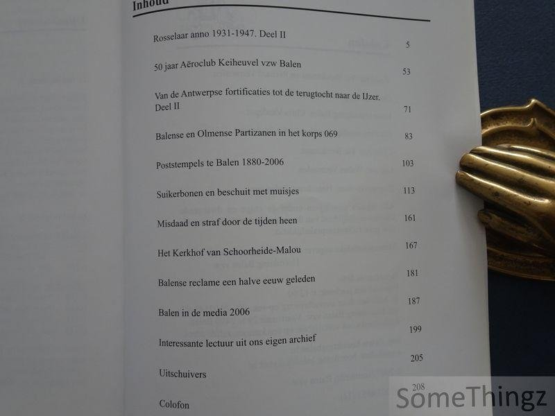 Het Jaarboek 2007 van Erfgoed Balen bevat een verzameling studiën en bijdragen over de lokale geschiedenis en het lokaal erfgoed van Balen en omgeving. Inhoud: Rosselaar anno 1931-1947. Deel II 5 / 50 jaar Aëroclub Keiheuvel vzw Balen 53 / Van de Antwerpse fortificaties tot de terugtocht naar de IJzer. 71 / Deel II: Balense en Olmense Partizanen in het korps 069 83 / Poststempels te Balen 1880-2006 103 / Suikerbonen en beschuit met muisjes 113 / Misdaad en straf door de tijden heen 161 / Het Kerkhof van Schoorheide-Malou 167 / Balense reclame een halve eeuw geleden 181 / Balen in de media 2006 187 / Interessante lectuur uit ons eigen archief 199 / Uitschuivers 205.