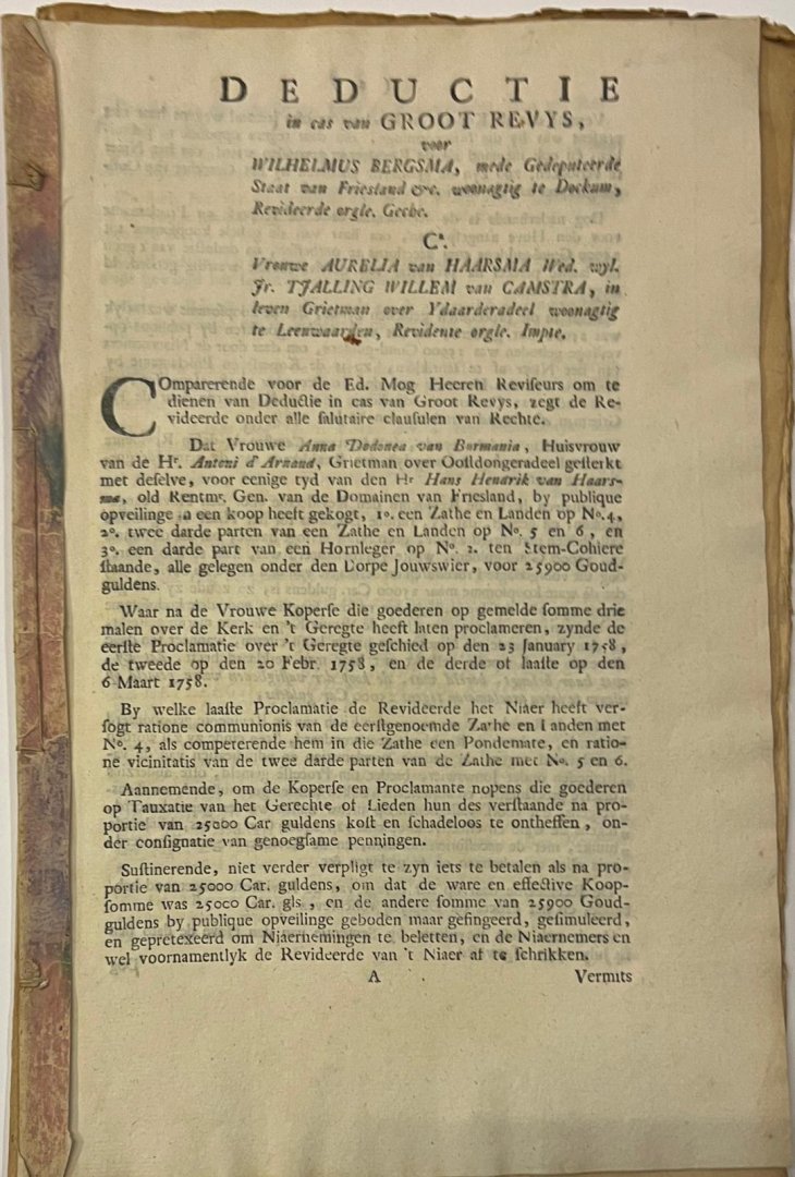 | Titel: | Legal publication [1761] 'Deductie in cas van Groot Revys voor Wilhelmus Bergsma', gedeputeerde staat van Friesland, wonende te Dokkum, contra Aurelia van Haarsma, wed. Tj.W. van Camstra, in leven Grietman Ydaarderadeel, wonende te Leeuwarden.... |
