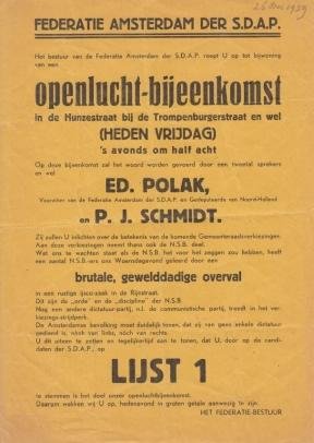 Plano van geel papier. 29 x 20,5 cm. Eenzijdig bedrukt. Sprekers: Ed. Polak en P.J. Schmidt. In potlood gedateerd '26 Mei 1939'. Wat vage kreukjes en vouwen, maar gaaf. De poster wijst op de deelname van de N.S.B. aan de Amsterdamse gemeenteraadsverkiezingen, en wat Amsterdam van de N.S.B. te verwachten heeft, vanwege de 'brutale, gewelddadige overval' op een rustige ijsco-zaak in de Rijnstraat door een bende NSB-colporteurs (24 mei 1939). En: 'Nog een andere dictatuur-partij, n.l. de communistische partij, treedt in het verkiezings-strijdperk'. Stemt dus Lijst 1!