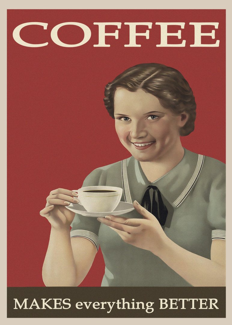 | Meer info: | Vintage reclame affiche van een vrouw die koffie drinkt. De tekst luidt ‘Coffee makes everything better’. |