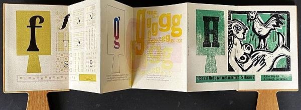 [Leiden e.a.], Corps 8, 2003. Twee ingenaaide boekjes ((16); (8) p.) en een ruime leporello, geplakt tussen twee eikenhouten plankjes, in roodlinnen foedraal (staander). Oplage 135 exemplaren [waarvan 92 voor de verkoop]. Projecten DIDM C-5. Zeer ingenieuze uitgave, een prachtig project naar een idee van Gerard Post van der Molen van De Ammoniet. Het voorwerk van 16 pagina's is met de hand gezet uit de Grotius en de Hollandse Mediaeval en gedrukt in rood en zwart door De Ammoniet en bevat teksten van John Landwehr en Frits Booy. Het nawerk werd eveneens met de hand gezet gezet uit de Grotius en de Hollandse Mediaeval en gedrukt in rood en zwart door Kees Baart, Dirk Engelen en Thijs Weststrate van Corps 8 op een pers van de Ammoniet en bevat een tekst van Ronald Rijkse van de Zeeuwse Bibliotheek en een verantwoording door de voorbereidingsgroep 'Hornbook'. De leporello vormt het daardwerkelijke abecedarium (recto A tot en met M, verso N tot en met Z) en werd gedrukt door De Baaierd, de BY-pers (een gelegenheidsinitiatief van Dick Wessels en Ferrie van Ramele; twee bijdragen: de B en de Y), De Vier Seizoenen, Op gezette tijden (twee bijdragen: de D en de W), Ogentroost (twee bijdragen: de E en de V), Marlies Louwes, Mercator Press, Ellen Baptist & Lodewijk de Groot (twee bijdragen: de H en de S), [Tussen Haakjes], Rootvoet Pers,De vergulde maatlat/Treemapers, De Prent, Avalon Pers; Eendracht Pers, Triona Pers, De Zwaluw, De Zolderpers, Atelier GrotesQue, Typografiek, Helicon-Pers, Antje Veldstra en De Overkant. Voormalig Conservator Oud Bezit en Bijzondere Collecties van de Zeeuwse Bibliotheek in Middelburg Ronald Rijkse schreef over het Hornbook het volgende: 'Hornbooks zijn de voorlopers van het ons vertrouwde ABC-boek en werden vanaf de Middeleeuwen tot de 18de eeuw in het onderwijs gebruikt. Een Hormbook is in feite een rechthoekig plankje (met een handgreep) met daarop een velletje papier met het alfabet. Dat papier is bedekt met een plaatje hoorn. Vorig jaar zijn er 26 drukkers aan het werk gegaan om gestalte te geven aan een Hornbook ten behoeve van het project. Het project was gecompliceerd en het aantal betrokkenen zo groot - naast drukkers waren er ook boekbinders, houtbewerkers, cassettemakers, zeefdrukkers en clichémakers bij betrokken - dat het uiteindelijke resultaat een unicum is in de Nederlandse boekgeschiedenis. Allereerst is er een rode cassette waarin het Hornbook gestoken is. Haalt men dit eruit, dan ziet men 2 eikenhouten platten die de vorm van het oude Hornbook hebben. Tussen de platten bevinden zich achtereenvolgens een katern met het voorwerk, een leporello en een katern met het nawerk. Een leporello is een boek waarvan de bladen uit één lange, meermalen gevouwen strook bestaan. In dit geval gaat het om een leporello met een lengte van vier meter. Daartoe zijn 13 dubbelzijdig bedrukte bladen harmonicagewijs gevouwen en aan elkaar geplakt. Op de bladen zijn door 26 margedrukkers de 26 letters van het alfabet gedrukt, voorzien van een (literaire) uitweiding en/of afbeelding. Iedere drukker was vrij om zelf vorm te geven aan zijn door loting toegewezen letter, echter binnen het overkoepelend thema margedrukken. De drukkers werkten in koppels van twee: de voor- en achterzijde van een blad moesten in onderling overleg vervaardigd worden. Het voorwerk is getiteld Van Hornbook tot ABC-Prentenboek en bevat geïllustreerde bijdragen van John Landwehr en Frits Booy over de ontwikkeling van het hornbook tot de bekende 20ste eeuwse ABC-boekjes. Het nawerk bestaat eveneens uit 2 bijdragen. De eerste is van Ronald Rijkse, de conservator van de Zeeuwse Bibliotheek, die de kwetsbaarheid van de collectie aan de orde stelt. De tweede bijdrage betreft de verantwoording van het gehele project. De totale oplage bedroeg 135 exemplaren, waarvan 92 voor de verkoop. Deze waren reeds bij voorintekening verkocht. Zodoende kon bij de feestelijke afsluiting op 23 mei een cheque overhandigd worden aan de directeur van de Zeeuwse Bibliotheek ten behoeve van de conservering van de rijke collectie margedrukwerk'.